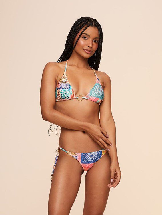 Tanga amarradinha estampada, com detalhe de ponteira e parte de trás franzida. Tecido: Microfibra Beach Estampa: Boho Chic Coleção: Verão 2024 Disponível nos tamanhos: P, M, G, GG Referência: 17227